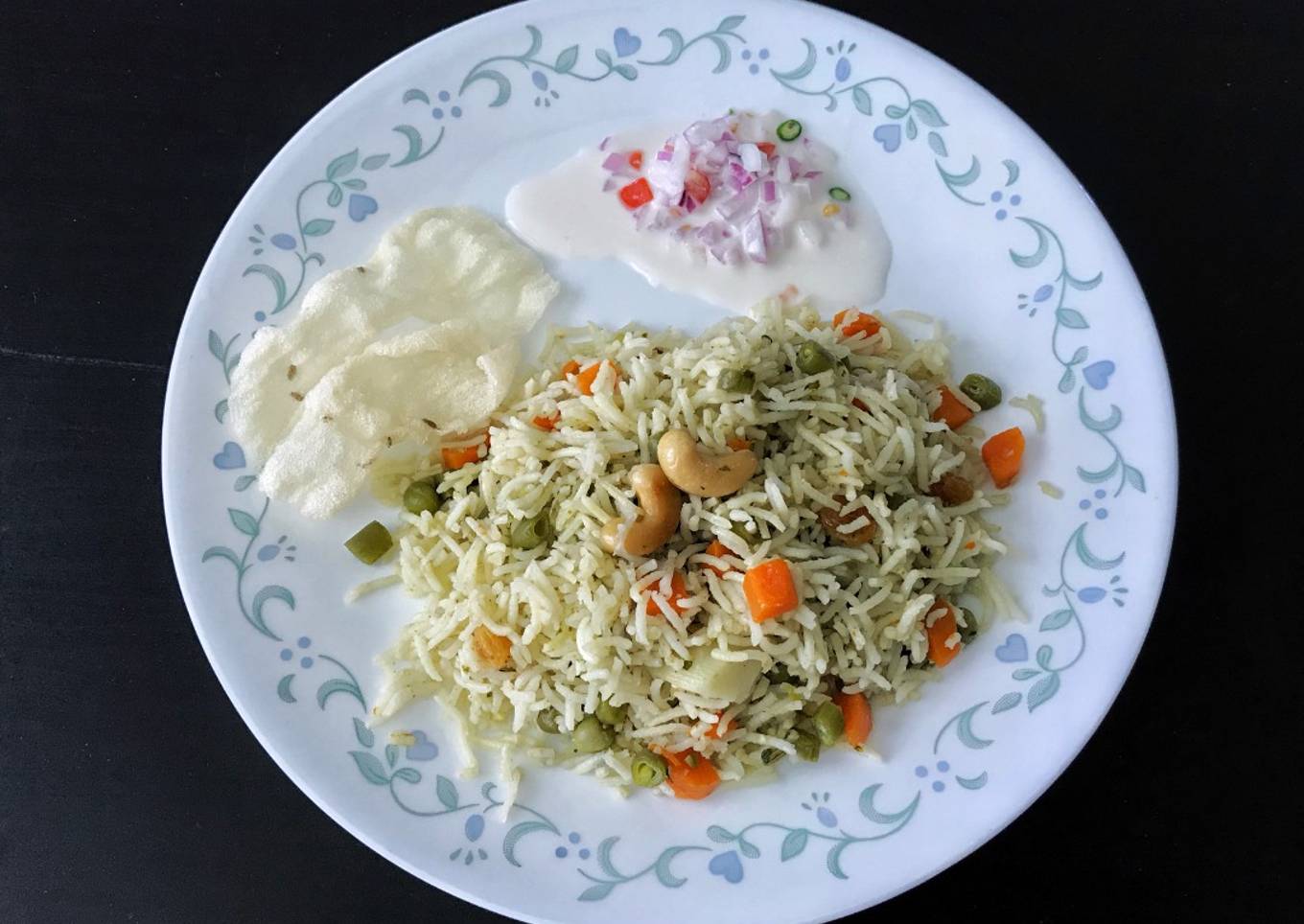 #lunch2 Vegetable pulav is a spicy rice dish prepared by cooking rice with various vegetables and spices. The ancient Hindu text Mahabharata from India, mentions rice and meat cooked together, and the word "pulao" is used to refer to the dish in ancient Sanskrit works, such as Yajnavalkya smrti. A pulao is a dish consisting of rice and a mixture of either lentils or vegetables, mainly including peas, potatoes, french beans, carrots or meat, mainly chicken, fish, lamb, pork or prawn. It is usually served on special occasions and weddings, though it is not uncommon to eat it for a regular lunch or dinner meal. A pulao is often complemented with either spiced yogurt or raita. Biriyani is another rice dish in the Indian cuisine, similar to pulao, albeit with a different cooking method. The main distinction is that a biryani comprises layers of rice with meat or vegetables and it has more spices, the pulao is not layered and is cooked with light spices.