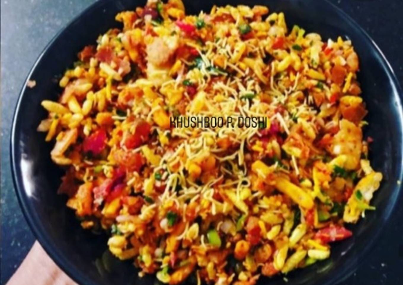 - Now add puffed rice, sweet nadiadi bhusu, partly crushed puri with tomatoes and onion and mix it well.